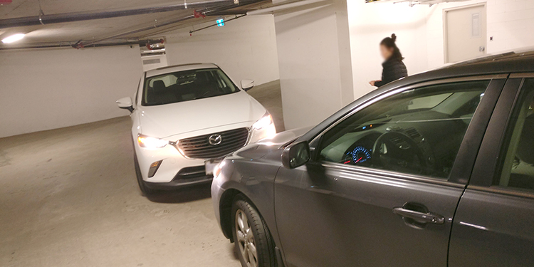 On Jan. 7, around 8:30 p.m., Gabrielle Chan was exiting his condo's parkade when he spotted the distinctive lights of an approaching vehicle coming from around a blind concrete corner wall near the roll-up gate entrance.