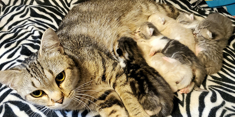 As with all our pregnant mamas and mamas with kittens, Peggy and her crew were taken into the home of a foster family. My family was thrilled to provide a safe, warm and quiet space for this delightful little family—the sixth litter we have fostered in the past year. At first Peggy was quite distrustful and hissed at people. Eventually she and the kittens settled in comfortably. We aren’t sure if Peggy had mothered other litters prior to this one but she was an expert, loving mama and over time felt at ease with her human fosters. The kittens grew, gained motor skills, and became little sweet hooligans over the weeks. Everything went as perfectly as one could hope for this awesome little family.