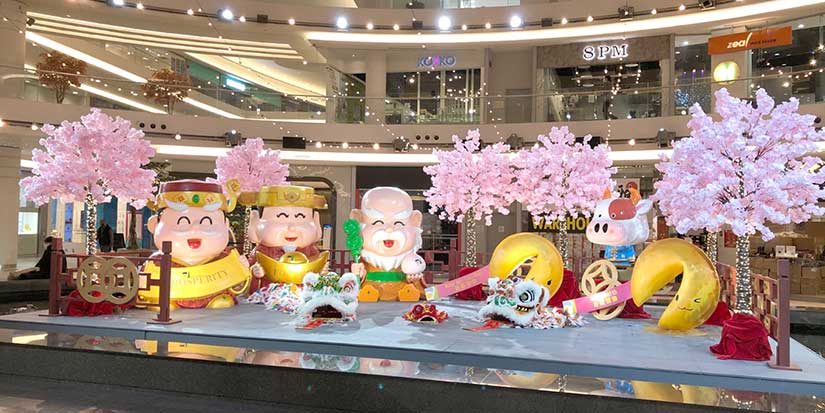 The mall’s fountain, which was decorated for Christmas amid the temporary cancellation of its musical show, is now filled with figurines—including one of the cow or ox to mark this year as the Year of the Ox. And Ho says there are also decorations like Chinese lanterns throughout the mall.