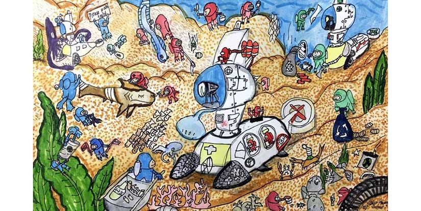 An art student at VSA Art + Design Studio, Huang learned about the contest from his art teacher. His entry, titled “OALPS Explorer,” (which stands for Oceanic, Animal Life Preservation Society) combined with programmed “med-bots” to help injured animals.