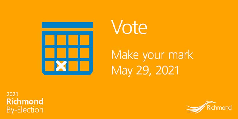 This will be the first time eligible voters in Richmond will be able to cast a ballot by mail. To request a mail ballot, simply go to the Richmond by-election website or call the Elections Office at 604-276-4100. Please remember that a mail ballot needs to be posted in ample time to ensure it reaches the Election Office on or before election day. Voters can also bring completed, sealed mail ballots to an advance voting station, to City Hall or to a polling location on May 29 before the 8:00 p.m. deadline.