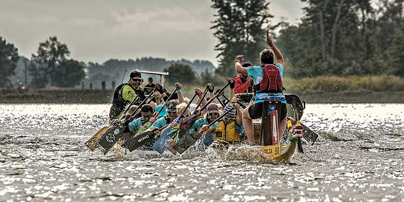 Dragon boating teams are made up of a total of 22 people: 20 paddlers, one drummer, and a steer person. Dragon boating combines Chinese culture and sport; traditionally, races will not start due without the ceremonial summoning of the spirit of the dragons from their high perches in the remote mountains and clouds.