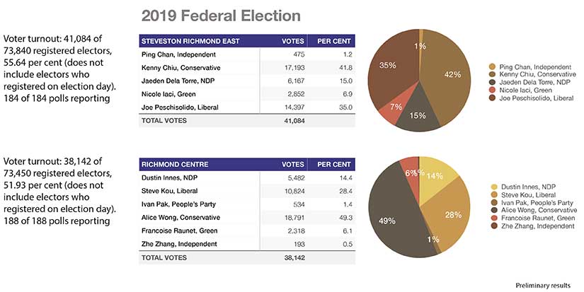 On election night Oct. 21, incumbent Alice Wong was re-elected to serve a fourth consecutive term as Member of Parliament for the riding of Richmond Centre. And in the Steveston Richmond East riding, Kenny Chiu defeated incumbent Liberal MP Joe Peschisolido to earn his first term in Ottawa. It was a reversal of the 2015 election results.