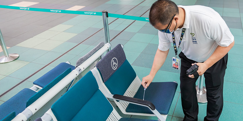 Cleaning units throughout the airport provide verification that surfaces are sanitary. UV technology is also used to detect cleanliness of surfaces and clean high-touch areas like escalator handrails.