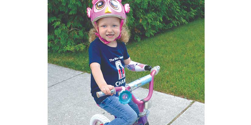 Michaela’s artificial arms, which she calls her “helper hands,” include one for everyday use and another that she uses for activities like bike riding. “Without the funding from The War Amps, it would be very difficult for us to get her any prosthetics at all,” say Tracie and Jeremy. “Whatever isn’t covered through our workplace insurance and the government, The War Amps steps in so she has these devices to help her through daily life.”
