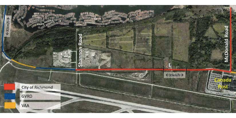 The stretch between McDonald and Shannon roads is within the city’s jurisdiction, and will have its speed limit changed following amendment of the relevant traffic bylaw. The west-most side of the road is within the jurisdictions of Vancouver Airport Authority and Metro Vancouver, who have also agreed to implement the same 30 kilometres per hour speed limit on their sections of the road.