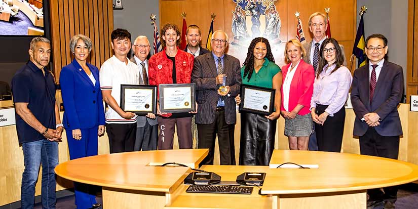Mayor Malcolm Brodie, on behalf of the city, presented Camryn Rogers, gold medalist in the hammer throw in Paris, race walker Evan Dunfee and fencer Nicholas Zhang, with Certificates of Achievement for their success in Paris and for representing the community they were born and raised in – Richmond, BC.